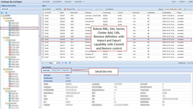CellBase is used by the CellApps modules and is a repository of Cell or sector level information. Definitions of Switch/RNC, Site, Cell/Sector and cluster is made within the CellBase module. Two cluster definitions such as Operations and Engineering can be made. A robust Import and Export capability make for easy and fast data loading. The commit and restore capability allows for site information editing without affecting the other modules